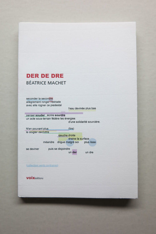 dre répète et décale, offre l’écart dans lequel le sens et la langue vivent d’une autonomie nouvelle. Passer de der à dre pour renverser le mouvement de l’entropie, enrayer son mode de relation qui dévoie.